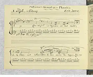 Originally entitled Étrange rumeurs (Strange Rumors),[6] the three pieces comprising Avant-dernières pensées were completed between August 23 and October 6, 1915. Satie dedicated them to three important colleagues: