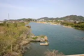Tokushima Prefecture was also a place where aizome (Japanese indigo dyeing) thrived, which used sand in its process, and the sand that could be mined from Tsuda bay was the most suitable for aizome. This leads to the theory that the tanuki war was based on a battle for these sands between the two sides of the Katsuura River.[23] There's also a theory that it's based on a battle about fishing fights between Tsuda District and Komatsushima.[23][24] Asagawa Yasutaka, the chief priest of the shrine Tsuda-ji, where there's a landmark about Rokuemon, also supports this theory.[25] If one of these theories about this tale being based on human society is true, this would mean that it's actually a tale where the foolishness of humans have been projected onto the blameless tanuki.[23]