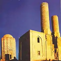 The Garabaghlar tomb complex, located in the Kangarli district of Nakhchivan, belonging to the Ilkhanate era, includes a tomb, a double minaret, and the remains of a religious building located between these two monuments. It is written in the inscription: "The construction of this building was ordered by Jahan Qudi Khatun". Qudi Khatun is believed to be Qutui Khatu, the wife of Ilkhanate ruler Abaqa.[80]