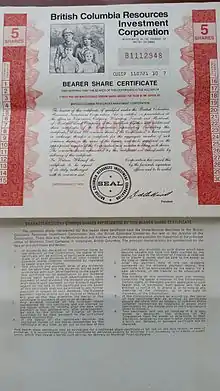 ![]() BC Resource Investment Corporation - Bearer Share Certificate - 5 Shares |