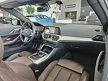 Most of the interior is carried over from the G20 3 Series upholstered in SensaTec faux leather with front sports seat being standard. The interior is offered in five colours with full leather upholstery being optional. The rear seats fold down to provide a total boot capacity of 440 L (15.5 cu ft). The iDrive 7.0 system is standard and features an 8.8-inch screen on the centre console along with a 5.1-inch screen in the instrument cluster. A 10.3 inch screen for the infotainment system along with a 12.3 inch screen for the instrument cluster are optional. The iDrive 7.0 has over-the-air updates for the navigational maps and operating system, and features a voice-controlled digital assistant. The 4 Series comes standard with the BMW navigation, the next-generation BMW head-up display, which has a 70 percent larger projection surface, and 3D environment visualization within the digital instrument cluster. Apple Car Play and Android Auto are also standard interior amenities. A Driving Assistance Professional package is optional, which adds adaptive cruise control with stop and go, lane-keep assist with side collision avoidance, and rear automatic emergency braking.[11][12]
