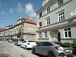 This housing estate was constructed from 1925 to 1927 after a decision of the municipal authorities.[14][18] It was designed by Bogdan Raczkowski.[19] At the time, the numbering of the tenement ran from 3a to 3d. Each building was designed with a rectangular strip of land for the cultivation of vegetables and flowers in the backyard. Loggias are also present on both sides of the arched entrances,[20] with the façades displaying ogee wall gables. A renovation was launched by the city in 2020 and will last several years.[21]