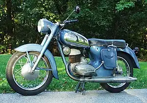 Production of the M2 began in 1959. Numerous changes were made during the modernization of the motorcycle, most notably a chrome side cover of the tank was added, in which there was a new emblem of the Balkan company. The MD 250 engine, which had a volume of 247.3 cm³, 12.5 PS at 4800 rpm, consumption of 3.3 - 3.5 liters per 100 km and four gears.[2] It was mechanically identical to the engine of DKW 250 RT. Three engineers were sent for training to the Jawa-ČZ,[3] so it was visually similar to Jawa 250/353 "Kývačka".
