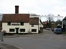A well-known landmark in the village is the sign of the "Fox and Hounds" public house. On top of a beam are painted silhouette figures of huntsmen and hounds chasing a fox into the gable of the public houses at the top of Church End. Although it is a long-established feature of the village, the sign has not always been at its present site.[7] In 1955 the Fox and Hounds, with its famous sign, was a pub located in the High Street, at the time part of an important route to London. In 1955 the Fox & Hounds burned down in a disastrous fire. The sign, which was partially saved, moved to its present site and the existing pub (the Wagon and Horses) was renamed. The pub and its sign are Grade II listed.