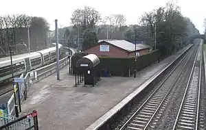 Though the station was used as an interchange between the two lines from the outset, its main line platforms were initially staggered - the northbound platform being located north of the junction and initially connected to the two southbound ones by a foot crossing (which was replaced by a footbridge in 1895).[3] A second platform on the branch was provided in 1894, when the first 350 yards from the junction were doubled. A more comprehensive rebuilding scheme came in 1928,[4] when the Cofton Tunnel was demolished and replaced by a wide cutting, so that the main line towards Northfield and Kings Norton could be quadrupled by the LMS (who had taken over ownership of the station at the 1923 Grouping). This saw the Birmingham-bound platform relocated south of the junction to create the layout still in use today.