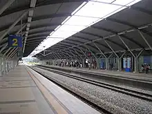 The Batang Kali station's two side platforms are designated as platform 1 (adjoining the main station building at the east, intended for southbound trains) and platform 2 (at the west, intended for northbound trains).