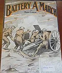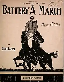 "Battery A March", subtitled "March & Two Step", is a piano march composed and self-published by Herbert W. ("Bert") Lowe in 1910.[1] It was dedicated to and named for Boston's "Battery A," a unit in the 101st Infantry of the National Guard that originated in 1853 and had a distinguished previous record as part of the 9th Regiment Massachusetts Volunteer Infantry. Battery A, known as the "millionaire's battalion" because it included so many upper-class Bostonians, played a prominent part in civic ceremonies and military exercises in Boston during the first decades of the twentieth century.[2] In 1916, the copyright to Lowe's piece was acquired by D. W. Cooper Publishing Company, who issued two editions, with different covers, in 1916[3][4] and 1918.[5] By then, Battery A had served with distinction on the Mexican border (1916) and been incorporated into the 26th Infantry Division of the American Expeditionary Forces, in which it served with distinction in World War I. A final edition was issued in 1924 by the C. I. Hicks Music Company of Boston.[6]