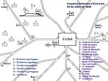 The Junta for Alentejo Province made its headquarters at Évora. The Junta named General Francisco de Paula Leite de Sousa as its commander, but he had difficulty arming more than a small force.[19] On 29 July 1808, Loison's troops reached the outskirts of Évora to find a Portuguese-Spanish force arrayed across their path. Leite led one and a half battalions of Portuguese infantry and 120 cavalrymen. From Badajoz, Colonel Moretti brought an additional one and a half battalions of Spanish infantry, the Maria Luisa Hussar Regiment Nr. 5, and seven field guns. Behind them, manning the ancient walls of Évora was a motley collection of townsmen and peasants armed with bird guns and pikes.[21] The allied regulars totalled about 2,900 men.[20]