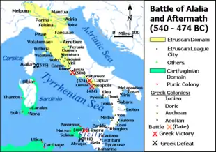 The naval Battle of Alalia took place between 540 BC and 535 BC off the coast of Corsica between Greeks and the allied Etruscans and Carthaginians. A Greek force of 60 Phocaean ships defeated a Punic-Etruscan fleet of 120 ships while emigrating to the western Mediterranean and the nearby colony of Alalia (now Aléria).