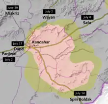 The battle for the city began on 9 July 2021, as Taliban militants began to raid the urban areas in Kandahar's Seventh Police District and seized several houses.[7][8] The militants were mainly opposed by commandos and other special forces.[8] The commandos were forced to transfer prisoners from Kandahar prison to prevent an outbreak.[7] The government forces' ability to repulse Taliban infiltrators was hampered by the presence of civilians caught in the crossfire.[8] By mid-July, heavy clashes took place across the city,[7] forcing over 11,000 families to move from Kandahar into refugee camps.[13] The Taliban also captured Kandahar District (also called Dand District), where Kandahar's airport was located. The airport remained government-held, however, allowing the Afghan Air Force to continue its bombing raids on the advancing rebels. However, these aerial attacks had little effect. In response to the unabated rebel attacks, the government imposed a curfew on the city on 16 July, while sending more commandos to assist the defense of Kandahar.[7]