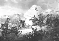 The main battle started with the Polish-Lithuanian cavalry charge on the Swedish right flank, with about 1,000 hussars shattering Mansfield's reiters and disordering the Swedish third infantry line in their retreat.[2] At the same time, on the Swedish left, 650 hussars under Jan Piotr Sapieha charged.[2] After Charles sent in his reserve of 700 cavalry, Chodkiewicz sent in his reserves. The entire force of Swedish cavalry was finally put to rout, and in their flight, disordered many of their own infantry, leaving them vulnerable to the hussars' charge.[2]