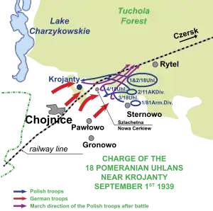 The charge at Krojanty, battle of Krojanty,[1] the riding of Krojanty or skirmish of Krojanty[2] was a Polish cavalry charge on the evening of 1 September 1939, the first day of the Second World War, near the Pomeranian village of Krojanty. It occurred at the start of the invasion of Poland and was part of the larger Battle of Tuchola Forest. Polish soldiers advanced east along the railway to a railroad crossroads 7 kilometres (4.3 mi) from the town of Chojnice, where elements of the Polish cavalry charged and dispersed a German infantry battalion. Machine gun fire from German armoured cars that appeared from a nearby forest forced the Poles to retreat. However, the attack delayed the German advance, allowing the Polish 1st Rifle Battalion and Czersk Operational Group to withdraw safely.