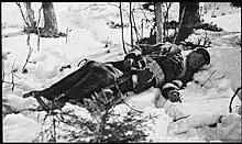 The Battle of Länkipohja (Finnish pronunciation: [ˈlæŋkiˌpohjɑ]) was a Finnish Civil War battle fought in the village of Länkipohja (now part of the Jämsä municipality) on 16 March 1918 between the Whites and the Reds. Together with the battles fought in Kuru, Ruovesi and Vilppula between 15 and 18 March, the Battle of Länkipohja was one of the first military operations related to the Battle of Tampere, which was the decisive battle of the Finnish Civil War.[1] The battle is known for its bloody aftermath as the Whites executed 70–100 capitulated Reds. One of the executions was photographed and the images have become one of the best known pictures of the Finnish Civil War.