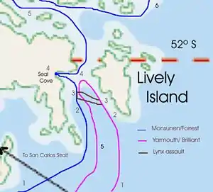 At 4:00 am GMT on 23 May,[1] a Lynx helicopter from HMS Brilliant identified Monsunen while the latter was heading to the north, west of Lively Island. After a surrender order was radioed to the motorboat, another Lynx transporting a Special Boat Service (SBS) team tried to intercept her. The aircraft was engaged by heavy machine gun and small arms fire, so it was forced to abort the mission.[4][5] At the same time, the coastal ship's radar detected the British squadron about eight miles (13 km) to stern and approaching aggressively.[2] Corvette Lieutenant Oscar Vázquez, Gopcevich's second-in-command, later reported that while Brilliant was approaching them from the south, Yarmouth sailed ahead to Choiseul Sound, blocking the passage from the north.[6]
