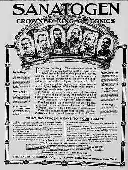 - ↑ See advertisement at right, N.Y. Daily Tribune, p.2 (June 23, 1911). A January 1913 article in Good Housekeeping stated that Sanatogen "was representative of the class of advertised tonics which make exaggerated claims and charge a high price." It added that $1 worth of Sanatogen was equivalent to 6¢ worth of milk and 1¢ worth of wheat flour.