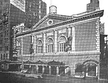 The Belasco Theatre was designed by George Keister, the architect of the neighboring Hotel Gerard, in the neo-Georgian style. It was constructed from 1906 to 1907 as the Stuyvesant Theatre and was originally operated by David Belasco.[3][6] The neo-Georgian style was selected because a similar style was used on many early government buildings of New York City.[6] The original name was a homage to Peter Stuyvesant, a director-general of New Amsterdam, the 17th-century Dutch colony that later became New York City.[6][7][8] Compared to its contemporaries, the Belasco is relatively small.[6] A wing for offices and dressing rooms, separated from the rest of the theater by a thick wall, was constructed on the west side of the theater.[9][10] The eastern part of the theater is topped by a private duplex apartment built in 1909.[11]