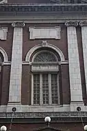 The three center bays are delineated by a pair of Ionic terracotta pilasters at each end, as well as two single pilasters in the center. At the second story, each of the center bays contains tripartite casement windows. Above the windows are terracotta lintels, which are separated into three panels and are topped by a course of dentils. At the third story, each center bay has a round-arched window, surrounded by paneled terracotta blocks and topped by a keystone. A rectangular terracotta panel with eared corners is placed above each window. Above the cornice, a brick triangular pediment rises over the center three bays. There is an oval window at the center of the pediment, with a terracotta frame and keystones, as well as a cornice with modillions above the pediment.[18]