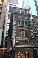The Belasco Theatre is on 111 West 44th Street, on the north sidewalk between Seventh Avenue and Sixth Avenue, near Times Square in the Theater District of Midtown Manhattan in New York City.[3][4] The rectangular land lot covers 12,552 sq ft (1,166.1 m2),[4] with a frontage of 125 ft (38 m) on 44th Street and a depth of 100.42 ft (31 m).[4][5] On the same block, the Hotel Gerard, Hudson Theatre, and Millennium Times Square New York are to the west. Other nearby buildings include the Algonquin Hotel to the east, 1166 Avenue of the Americas to the northeast, the Americas Tower and High School of Performing Arts to the north, the Lyceum Theatre and 1540 Broadway to the northwest, 1500 Broadway to the southwest, and the Chatwal New York hotel and the Town Hall to the south.[4]