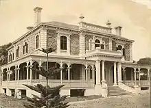 Database entry: Two storey slate roof Victorian Italian style, stone with rendered dressings, Corinthian porch and verandah with cast iron ornament - central feature surmounted with heavy pierced parapet and elaborate urns. Rear sections appear to be later additions - high stone brick capped garden wall with wrought iron gates, rooms behind wall appear to be later additions.