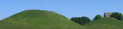19th-century archaeological evidence may confirm elements of the Beowulf story. Eadgils was buried at Uppsala (Gamla Uppsala, Sweden) according to Snorri Sturluson. When the western mound (to the left in the photo) was excavated in 1874, the finds showed that a powerful man was buried in a large barrow, c. 575, on a bear skin with two dogs and rich grave offerings. The eastern mound was excavated in 1854, and contained the remains of a woman, or a woman and a young man. The middle barrow has not been excavated.[14][13]