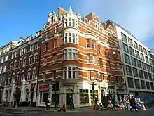 "a highly eligible investment in a substantial modern block of premises, known as the Berners-street Mansions, forming the corner of Berners-street and Mortimer-street opposite the Middlesex Hospital, of handsome elevation, the upper part arranged in convenient suites of residential flats, occupied by responsible tenants, and the ground-floor devoted to four capital light shops with basements, all well let (except one shop) at rising rents, and together of the present value of £1,490 per annum."[4]
