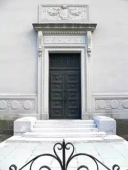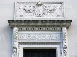 Detail of entryway ornamentation. Berzelius Society symbol depicted within shield.