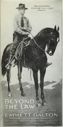 Emmett Dalton wrote a serial story recounting "the exploits he and his brother outlaws perpetrated."[1] Titled Beyond the Law, it was published in The Wide World Magazine, a London monthly, starting in May 1918.[2][1] The same month, Dalton moved to Gastonia, North Carolina, as did the company he was the general manager of, the Southern Feature Film Corporation.[3] The company published a half-page notice in the local paper, announcing their intention to make Beyond the Law into a movie, which it described as "a beautiful, historical, romantic story written around the lives of the Dalton Boys."[4] A newspaper article in mid-July reported that production of the film was due to begin later that month requiring at least 30 people, and expected to last four or five weeks.[5] An article the following week reported that Dalton was going to New York City to film interior scenes at the Famous Players Studio, with outdoor scenes to be filmed later in Bat Cave, North Carolina, and at Pawnee Bill Ranch in Oklahoma.[6] References to the finished film, "a special six-reel feature", began to appear in early December.[7] Showings of the film were reported by various newspapers starting in early 1919, including in Washington, D.C.;[8] Newport News, Virginia;[9] and Dalton's home city at the time, Gastonia.[10] These reports also highlighted that Dalton personally attended screenings of the movie and would "lecture" at each performance.[8][9][10]