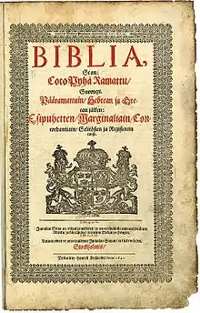 The first translation of the whole Bible was the so-called Vanha kirkkoraamattu (Old Church Bible), titled Biblia: Se on: Coco Pyhä Ramattu Suomexi (1642).[2] This edition was translated between 1638 and 1641 by a committee led by Bishop Isaacus Rothovius and was published in 1642. It was revised in between 1683 and 1685 (Florinus). It is still used by some, although as a revised edition.[2]
