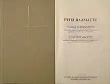 The official translation used by the state church, the Evangelical Lutheran Church of Finland, is approved by its Synod.[1] There have been three official translations: Biblia: Se on: Coco Pyhä Ramattu Suomexi (1642), Pyhä Raamattu (1933/1938),[2] and the current one Uusi kirkkoraamattu (1992/2007). The term kirkkoraamattu means that the edition has to be suited for service of worship and other needs of the church.[3]