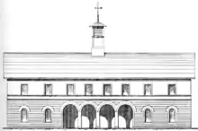 The first station building of the Rundbogenstil ("round arch style"), which was common at the time, was probably designed by Michael Knoll. It had two stories and a tower with a clock and two bells. The eight vault construction was probably built of stone. On the 1st floor there was a cornice at the height of the window sills. It had a continuous gable roof and a clear horizontal division between the ground and first floor. In the centre there was a four vault central hall, accented by the bell tower. The station building of 1847 had on the ground floor two waiting rooms, an office for the stationmaster, a cash room, a luggage room and a staff room. On the 1st floor there were apartments for rail personnel.[5][6]
