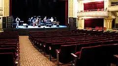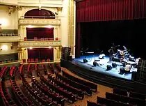 The theater has a capacity of approximately 700, with two balcony levels. There are two loggia levels and three box levels on each side of the building. The stage is 35 feet (11 m) deep and 69 feet (21 m) wide. The theater is decorated with notable Classical Revival elements, which include Corinthian columns supporting the box levels, reclining muse pediments above the top box levels, and grape-and-vine motifs adorning the front of the boxes and balconies.[2]