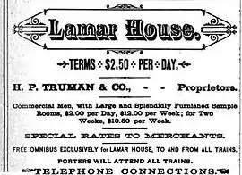 After Sneed died in 1869, his children inherited the Lamar House, and over the next two decades, the hotel once again developed into the preferred gathering place for Knoxville's elite. The hotel's status was enhanced by the construction of Staub's Theatre Knoxville's first opera house across the street in 1872. Masquerade balls were held regularly in the hotel's ballroom, with cigars, imported wines, and oysters served. Frequent attendees included author Frances Hodgson Burnett (whose brother worked as a bartender at the hotel) and artist Lloyd Branson. President Rutherford B. Hayes stayed at the hotel during his visit to Knoxville in September 1877.[2][5] General James Holt Clanton died at the Lamar House on September 27, 1871, after being wounded in a shootout with attorney David Nelson.[6][7]