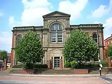 The hospital expanded rapidly. By 1845 separate wards were added containing 28 beds for infectious and contagious disease cases, raising hospital capacity to 98. In 1867, adjacent grounds were purchased, and in 1871, Lord Leigh laid the foundation stone for a new outpatient department, originally known as the "Workmen's Extension" as it was funded by local working people, to the strains of a hymn written for the occasion by the Rev. Charles Kingsley and sung by 1,000 child choristers from the Birmingham Schools Choral Union.[5] This building was designed by Martin & Chamberlain and is also Grade II listed.[6] It opened for patients on 7 November 1873.[7]