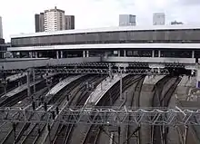 The new station was designed by Kenneth J. Davies, lead planner for British Rail London Midland Region.[30] Twelve through platforms replaced the eight through and six bay platforms of the previous station.[28] The platforms were covered over by a seven-acre (2.8 ha) concrete deck, supported by 200 columns, upon which the concourse and other buildings were constructed. Escalators, stairs and lifts were provided to reach the platforms from the concourse. The new station had sold its air rights, leading to the construction of the Pallasades Shopping Centre (then known as the Birmingham Shopping Centre) above the station between 1968 and 1970.[16][30][31] The public right of way across the station, which had previously been maintained by the station footbridge, was retained in the new station via a winding route through the shopping centre.[32] The station and the Pallasades were partly integrated with the Bullring Shopping Centre via elevated walkways above Smallbrook Queensway.
