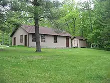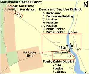 Eighteen structures in the Beach and Day Use Historic District are contributing structures and are protected as historic places.[5] These structures include seven "standard" pavilions with pyramidal roofs and timber supports, a larger picnic shelter with a log railing and supports and a roof similar to those of the "standard" pavilions, and three water pump shelters. The water pump shelters were built of native stone and covered with pebbles, and have since been converted to picnic pavilions. The concession building, bathhouse, and museum are also protected. The concession building is a rectangular log building with saddle corners and a gabled roof with a cross gabled entryway.[5] The bathhouse is at the beach and was built with stone columns and a hip roof. The bathhouse walls consist of vertical wooden siding. The nature museum is a former stone and wood pavilion that is set into a dirt bank with stone walls. Four open pit latrines with wane edge siding and hipped roofs are also contributing structures to the Beach and Day Use Historic District. There are no non-contributing structures in the district.[5]