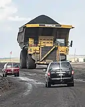 Black Thunder's dragline excavator Ursa Major is the biggest working dragline in North America and the third largest ever made.[3][4] It produces enough coal to load up to 20-25 trains per day.[5] Draglines are not used to dig coal, but only strip overburden. Black Thunder operates six draglines. Coal is excavated by power shovels and loaded into haul trucks.[6] In 1974, exploration geologist Lewis R. Ladwig drilled exploratory holes on the Jacob sheep ranch. He was working for ARCO. He discovered the coal reserves of the basin. In 2009, the America's Power Factuality Tour stopped at the Black Thunder Coal Mine to report on its role in generating electricity in the US.[7]