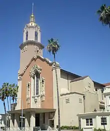 The new church and school on Sunset Boulevard were designed by Thomas Franklin Power. Power designed the Blessed Sacrament School, which opened in 1923, in an Italian Renaissance style. When the new school opened, its enrollment was 370 students. Power next turned his attention to the new church, which he adapted from the Basilican style of the Italian Renaissance style.[6] The roof, however, was made of tile instead of the flat roof typical of Roman churches. Power designed the interior with flanking arches to be reminiscent of the San Paolo and St. Clement Basilicas in Rome.[6] The new church was dedicated in June 1928. With its 223-foot chimes tower, ornate exterior and seating for 1,400 people, Blessed Sacrament quickly became a Hollywood landmark.[7]