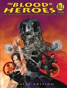 After Mayfair Games stopped publishing DC Heroes, the rights to the game's mechanics were licensed to the new company Pulsar Games, who had been seeking to acquire the rights since before Mayfair went out of business.[1]:171 Pulsar published the superhero role-playing game Blood of Heroes (1998), which was very close to the third edition of DC Heroes without using any of the DC characters.[1]:171 The original Blood of Heroes was criticized for using poor artwork.[1]:171 A second edition, titled "Blood of Heroes: Special Edition" (pictured above) was printed in 2000 and featured expanded rules and new artwork, including cover art by Dave Dorman. Pulsar Games went out of business in 2003.[1]:171