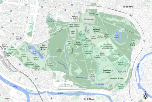 The Bois de Vincennes has a total area of 995 hectares[2] (2,459 acres), making it slightly larger than the Bois de Boulogne, (846 hectares / 2,091 acres), the other great Parisian landscape park located at the western side of the city.[3] It occupies ten percent of the total area of Paris, and is almost as large as the first six arrondissements in the center of the city combined. The Bois de Vincennes is about three times larger than Central Park in New York City (341 hectares / 843 acres), and is slightly larger than Richmond Park in London (955 hectares / 2,360 acres); but is smaller than Griffith Park in Los Angeles (1,170 hectares / 2891 acres). Only about half of the Bois de Vincennes is covered with trees.