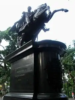 The statue of Simón Bolívar was inaugurated on November 7, 1874 in the center of the square with the ringing of bells and 21 guns. This is a replica of the statue by Adamo Tadolini located at the Bolivar Square in Lima, Peru. Cast by the Von Müller Foundry, Bolívar rides a horse standing on its hind legs, supported by the two tiered pedestal. It measures 4 meters high (10 feet).