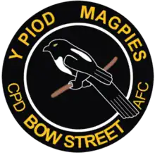 Bow Street F.C. are based at Rhydypennau near Bow Street in Ceredigion, Wales, about 4+12 miles (7.2 km) north-east of Aberystwyth, and are currently playing in the Ardal Leagues North East. The team are nicknamed the Magpies (Welsh: piod), from the time when their strip was black and white stripes.