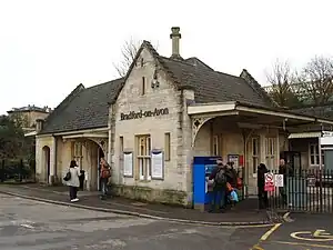 Bradford-on-Avon railway station is a railway station on the Wessex Main Line in between Avoncliff and Trowbridge, serving the town of Bradford on Avon (the station name is hyphenated, unlike the name of the town), in Wiltshire, England. The station is 9 miles 35 chains (15.2 km) south east of Bath Spa.[1] The station was originally conceived by the Wilts, Somerset and Weymouth Railway, but was not built until after the company was purchased by the Great Western Railway in 1850 and did not open until 1857.