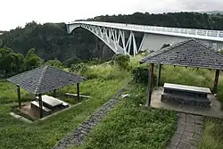 The 280-metre-long (920 ft) single-span bridge is essentially two bridges, each composed of a steel Warren truss, that meet in the middle. The 10.90-metre-wide (35.8 ft) bridge comprises a 6-metre-wide (20 ft) bi-directional carriageway, two 1.35-metre-wide (4.4 ft) pedestrian pavements and two 1.10-metre-wide (3.6 ft) cycle paths. The deck is a prestressed, composite truss structure comprising two concrete slabs linked by two planes of steel tubes in triangular layout.
