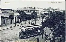 Both had electricity, running water, a sewage system, electric streetcars and avenues over landfilled marshes. In Belém, great architectural works appeared, such as the São Brás Market, the Francisco Bolonha Market, the Ver-o-Peso Market, the Antônio Lemos Palace, the Cine Olympia (the oldest in Brazil in operation), the Grande Hotel, the Bolonha Mansion and several residential palaces, built in large part by the intendant Antônio Lemos.[8] Another attraction in the city is the Theatro da Paz, which was the meeting place for Belém's elite who, dressed in Parisian fashion, attended the inauguration to the sound of musical chords in a splendid, refined and lively atmosphere.[9][7][3]