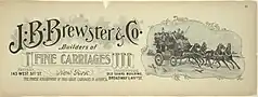 In 1838, he returned to the carriage business, and over the next few decades the Brewster name was involved in numerous carriage building companies with his sons James Benjamin and Henry, grandsons, and various partners in both New Haven and New York. His grandson William Brewster adopted the slogan, "Carriage Builder for the American Gentleman". Some of the many Brewster company names of the coachbuilding era include James Brewster & Son/Sons/Co., James B. Brewster & Co., J.B. Brewster & Co., Brewster & Collis, Brewster & Lawrence, and Brewster & Baldwin.[2][3]