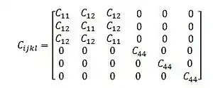 For specific symmetries the relationship between a specific combination of elastic constants, X, and acoustic wave velocities, ρV2, have been determined and tabulated.[7] For example, in a cubic system reduces to 3 independent components. Equation 5 shows the complete elastic tensor for a cubic material.[6] The relations between the elastic constants and can be found in Table 1.