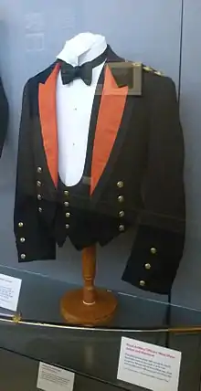 Mess uniforms first appeared in the British Army in about 1845, initially utilizing the short shell jacket worn since 1831. This working jacket was worn open over a regimental waistcoat for evening dress.[1] The original purpose was to provide a relatively comfortable and inexpensive alternative to the stiff and elaborate full-dress uniforms then worn by officers for evening social functions such as regimental dinners or balls.[2] With the general disappearance of full dress uniforms after World War I, mess dress became the most colourful and traditional uniform to be retained by most officers in British and Commonwealth armies. Immediately after World War II the cheaper "blue patrols" were worn for several years as mess dress, but by 1956 the traditional uniforms had been readopted.[3]