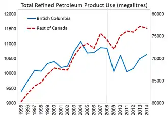Although fossil fuel consumption initially dropped rapidly, the recession in 2008 was also involved in lower consumption globally. A report in 2015 suggested an 8.5% reduction to date in greenhouse gas emissions, which may also be affected by cross border purchases of vehicle fuel.[26] Stats Canada reports that between 2007 and 2018 fuel consumption of gasoline in British Columbia has increased by 5.2%, while consumption in Canada as a whole increased 9.8%.[27]