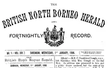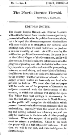 In 1883, Sandakan was raised as the new capital instead of Kudat, and this herald moved their place of publication to the new administration area.[3] The editorial and printing from 1885 to 1891 were by W. J. Rozario.[4] From 1 January 1896, the herald turned into a four-day appearance. The price per issue was still 10 cent, while the annual subscription including postal delivery increased to 2.50 Straits dollar.