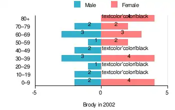 According to the 2002 Poland census, there were 35 people residing in Brody village, of whom 45.7% were male and 54.3% were female. In the village, the population was spread out, with 22.9% under the age of 18, 25.7% from 18 to 44, 17.1% from 45 to 64, and 34.3% who were 65 years of age or older.[1]